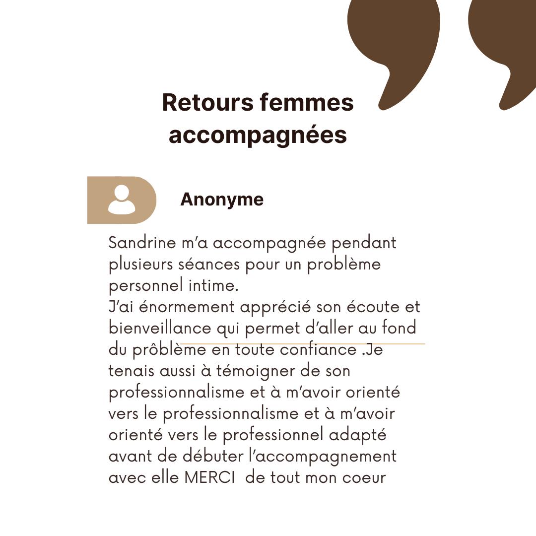 Je suis Sandrine,54 ans , accompagnante spécialisée dans la reconstruction après trauma pour les femmes de plus de 30 ans victimes de violences passées.